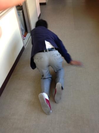 床に膝をついて廊下を拭き掃除します。隅々まできれいに掃除するのが北稜スタイルです。