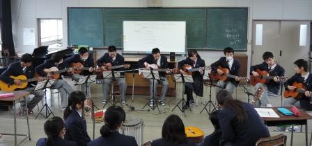 音楽会 投稿日時 : 2014/12/11 学校サイト管理者 本日はギターによる発表会(1年生)の授業に招待をいただきました。班別の発表でした。最初の班は恥ずかしそうに弾いていましたが、演奏を聞いているうちにいつの間にか曲を口ずさんでいました。上手でした。それぞれの班で音色に特徴があり、楽しむつもりで気軽に参加したのに、生徒の様々な可能性について考えが及んでいました。普段の授業で見ているイメージと異なることもあり、ちょっと感動しました。最後の全員演奏は迫力がすごかったです。ありがとうございました。A05