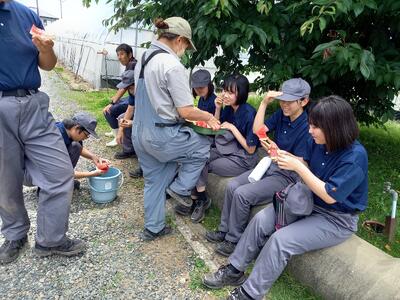 1年園芸科 実習中の一休み 投稿日時 : 06/11 学校サイト管理者 梅雨の晴れ間。1年園芸科の総合実習の休み時間の様子です。先日から収穫が始まっている大玉スイカをみんなで食べながら一休み。実習の合間の雑談、とても楽しそうです。