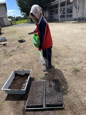 育てたい野菜を3~4品種決め、前回の授業で協力して畑に畝を立てました。