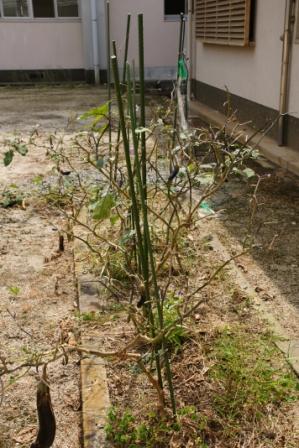 発見! 投稿日時 : 2014/09/17 学校サイト管理者 以前、この北稜日記で紹介したことがありますが本校の売店横の中庭にナスが栽培されています。先日、売店の方からそのナスが、葉を食べられ枝だけになっていることを聞きました。見に行ってみると・・・・・・本当に枝だけ。売店の方はその理由をご存じでした。言われたとおり、もっと近づくと”ある生き物”がいたのです。どこにいるかわかりますか?(かなり大きくて驚きました!)きっとこれからもすくすくと成長し、いつか大空へ羽ばたいていくのでしょうね。A01