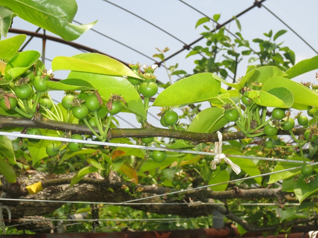 果樹園日記 投稿日時 : 2017/05/02 HRBT2016 気温の上昇に伴い、ナシやブドウの生長には驚かされます。新高、豊水は予備摘果が終わり、幸水、秋月は本日終了の予定です。予備摘果とは1果そうに数個ついている果を1個にする作業で、果そうの下から3番目から5番目の果の1個を残して後は全て落とすことを言います。 『 摘果前 』 『 摘果後 』 G03
