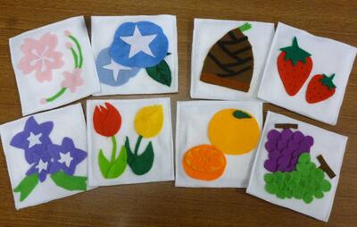 カレンダーのパーツとして、月ごとの旬の食べ物と花を調べ、フェルトで作成しました。