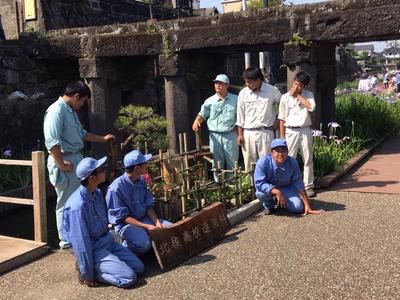 造園同好会で先日、新玉名駅にしょうぶを用いた室内庭園を製作しました。