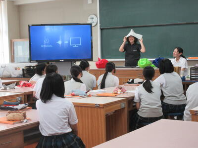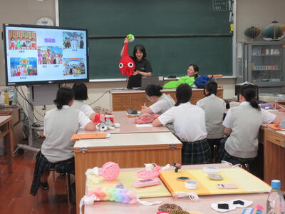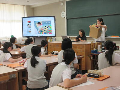 7月9日(火)、家政科2年生の「保育基礎」の授業で、地元保育園の保育士の方2名による「保育士出前講座」を開催していただきました。