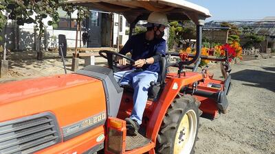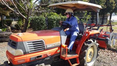 乗車の注意を受けた後に2台のトラクタに分かれて、安全確認、発進、左折、後進、右折、停車等を練習しました。