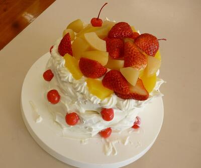 スポンジ作りからデコレーションまでを行いました。たくさんのクリームとフルーツでおいしく仕上げることができました。