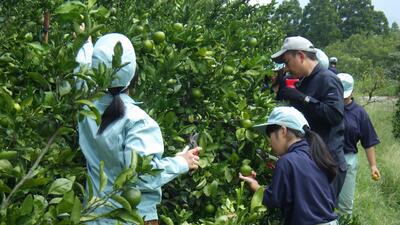 3cm以下、6cm以上の実を落とし、裂果や虫害果、日焼け果などを樹の周りを回りながら落としていきました。