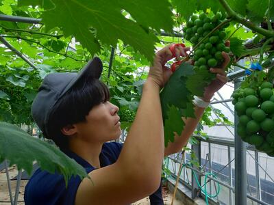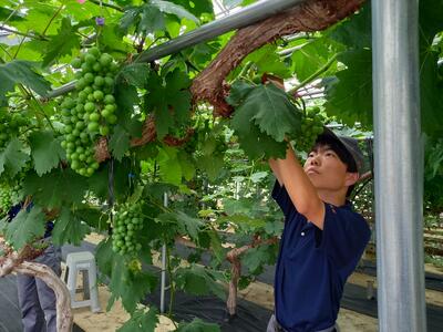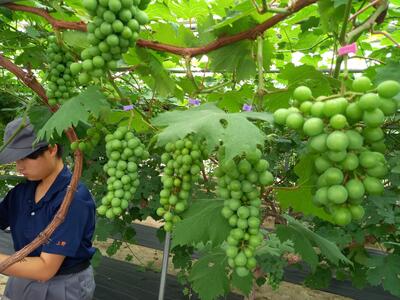 今日は園芸科の果樹温室にお邪魔しました。温室の中にはたくさんのブドウ・ブドウ・ブドウ!!ちょうど2年生が授業をしていたので、何をしているか話を聞くと「形が悪い粒や小さい粒などをとっている」とのこと。8月の収穫が今から楽しみです。