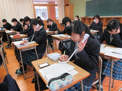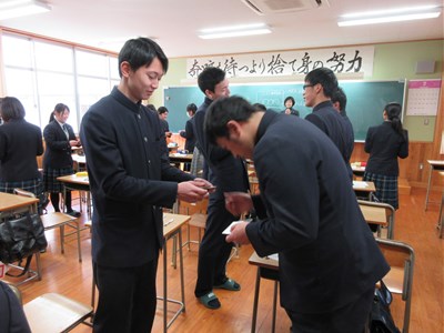 3年生新社会人セミナーがありました 投稿日時 : 2018/02/05 HRBT2016 今日は朝から雪がうっすらと積もり、寒い一日のスタートでした。2月から家庭学習期間に入っている3年生ですが、今日は就職内定者約60人を対象に新社会人セミナーが行われました。熊本県雇用環境整備協会から講師の先生が来てくださり、自己紹介・挨拶の仕方、電話対応、指示の受け方など、実践を通して教えていただきました。名刺交換など、初めてのことで戸惑っているようでしたが、繰り返し練習をして、笑顔で自己紹介をできるようになっていました。4月からの新社会人生活にぜひ生かしていってほしいと思います。J01
