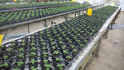 草花ではマリーゴールドやペチュニアなど5種類がポット上げを待っており、ポット上げされたサルビアやマリーゴールドはきれいに整列しています。草花選択の生徒が丁寧にポット上げしたことがわかります。最初にポット上げしたマリーゴールドには蕾ができていました。また花壇やプランタを彩ってくれます。