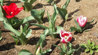 玄関の花瓶に桜が咲き、花壇のキンギョ草やパンジーは満開を迎え、チューリップが開き始めました。