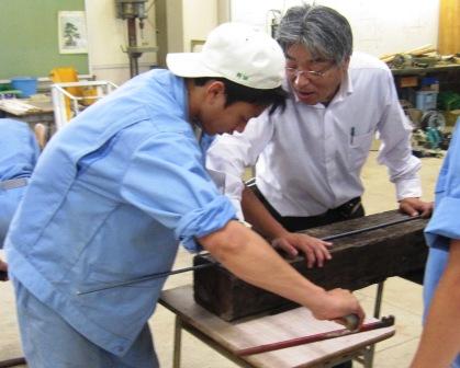 造園科3年生の授業で、庭園造りの基礎となる型枠施工の技術の一つ、