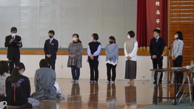 その後、体育館で育友会総会が行われ、昨年度の行事・会計報告と本年度の行事予定と予算案が承認され、また、役員紹介もされました。