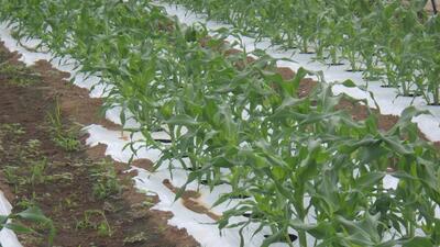 畑にひもを引いて畝立てをし、マルチングをして、一穴に種子を3粒ずつ播種しました。