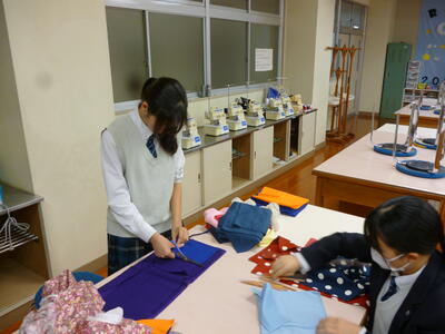 家政科学科3年生の「リビングデザイン」の授業で、はぎれ布を使ったコースターを制作しました。コースターは両面で違う布を組み合わせ、使う場面で使い分けができるよう工夫しています。