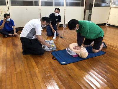 コロナウイルス感染症を考慮して声かけや呼吸の確認、胸部圧迫とAEDの使用法を研修しました。