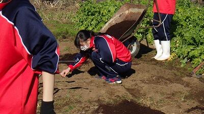 これまでたくさんの野菜を収穫させてくれた畑の実習が最後と言うことで丁寧に堆肥を広げ、全員で写真を撮りました。楽しくて美味しい実習でした。