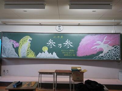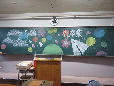 教室には、後輩からでしょうか? 黒板いっぱいにおめでとうの気持ちが!