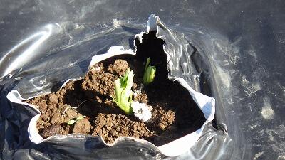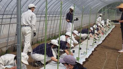 先生から定植の細かい注意を受けた後、一人2本定植しました。ビニルハウスの中やマルチング表面は暑いくらいになっていましたが、土の中は灌水もしてあり、ほんのり暖かい程度でした。淺植えになるようにしっかりポリポットで深さを測りながら優しく定植しました。