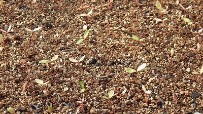 農場では2月14日に播種したメロンの双葉の間から本葉が顔を出し始めました。