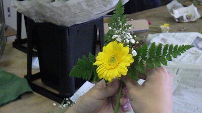1年の時、卒業生に送るコサージュを作った経験はありましたが、ガーベラにワイヤーをとおし、カスミソウやレザーファンにワイヤリングをすることが大変で、作った部品を形良く組み立てることも大変でした。できあがった作品を持って記念撮影をしました。
