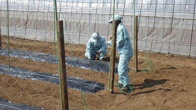 ハウスの中は30度近くありましたが、トマトハウスとキュウリハウスに分かれて、支柱立てやネット張りを行いました。基準になる大きなくいはくい打ちで打つのですが、くい打ちが重くて危ないので周りに人を寄せないようにして慎重に行いました。また、大きな音がするので打つ間隔を長くしてゆっくり打ち込みました。