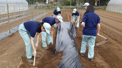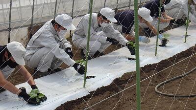農業と環境の授業で新入生が学習するトマトとキュウリのビニルハウスの準備をしました。