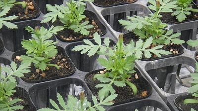 草花ではマリーゴールドやペチュニアなど5種類がポット上げを待っており、ポット上げされたサルビアやマリーゴールドはきれいに整列しています。草花選択の生徒が丁寧にポット上げしたことがわかります。最初にポット上げしたマリーゴールドには蕾ができていました。また花壇やプランタを彩ってくれます。