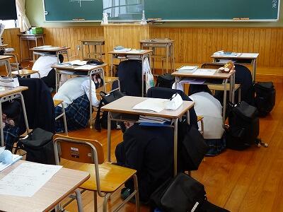 1限目授業が始まって5分後、放送が始まり、シェイクアウト訓練が始まりました。