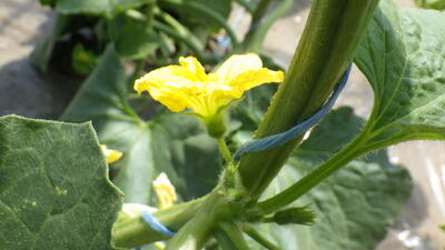 農場では肥後グリーンメロンが10枚目の子づるに雌花が咲き出しました。