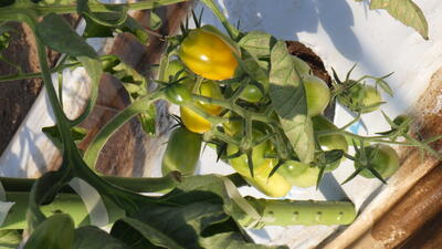1年生が先週の水曜日に播いたイネは緑の芽が揃って出てきており、ビニルハウスではキュウリやトマトが収穫できるほどに成長していました。