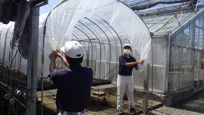 2年の草花専攻は苗用の天井ビニルを張り、パンジーのポット上げをしました。