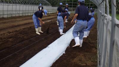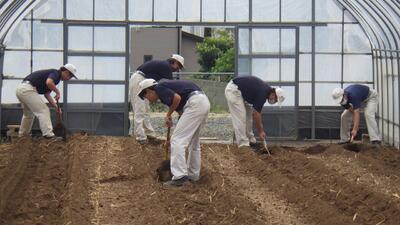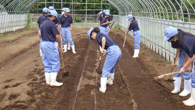 野菜専攻では鍬を使ってみんなでイチゴの高畝を作りました。