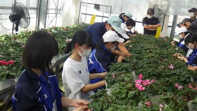 一坪農園の管理をした後に、園芸科学科の草花専攻に指導してもらいながら、シクラメンの葉組の実習をしました。