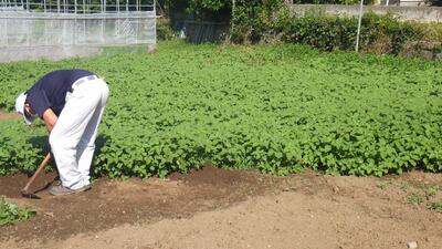 生物活用の畑では1ヶ月前に植えたジャガイモがやっと芽を出し始め、1年生はダイコンのプロジェクトのための畝立てマルチ張りをしました。