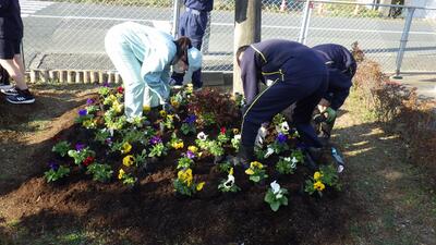 荒尾第三中学校の生徒さんと3年草花専攻生で、中学校の正門横の花壇にパンジーを植え付けしました。