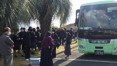 3時間授業を受け、1年生と2年生全員貸し切りバスで出発しました。