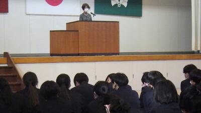 全校生徒での終業式の後、2学年の学年集会があり、学年主任の先生と生徒指導部の先生から2学期の反省と冬休みの注意の話を受けました。