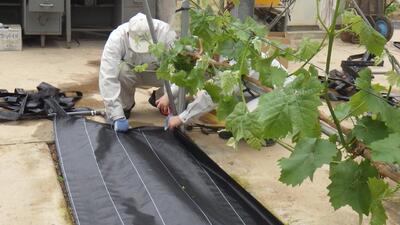 ブドウの幹や支柱などの部分はハサミを入れて、シートを敷いていくので予想以上に時間がかかりました。