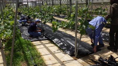 朝雨が降ったので、ブドウ温室でブドウの誘引を行いました。