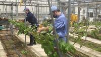 朝雨が降ったので、ブドウ温室でブドウの誘引を行いました。