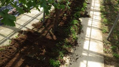 ブドウの幹や支柱などの部分はハサミを入れて、シートを敷いていくので予想以上に時間がかかりました。