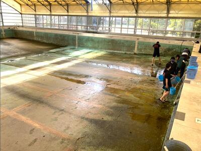 冬の間にプールに溜まった泥やゴミを取り除きます。