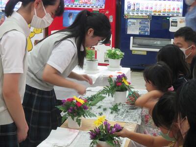 8月19日(土)11時からカリーノ玉名イベントスペースにて第2回県立高校FESTA・高校合同PR展が行われました。本校からは園芸科学科2、3年生の草花専攻生11名が参加し、来場されたお客様にフラワーアレンジの製作体験を行いました。主に家族連れの方々が多く、会場内は盛大となり、予定していた15個のフラワーアレンジ製作は約1時間半で終了となりました。生徒にとっても技術向上だけでなく、コミュニケーション力向上につながり良い体験となりました。