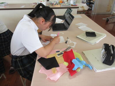 家政科学科3年生「ファッション造形」選択生が、浴衣製作の「裁断」、「柄合わせ」に取り組みました。