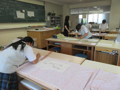 家政科1年の「ファッション造形基礎」では、家庭科技術検定3級の内容「アウターパンツ」製作に取り組んでいます。