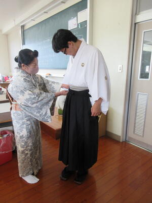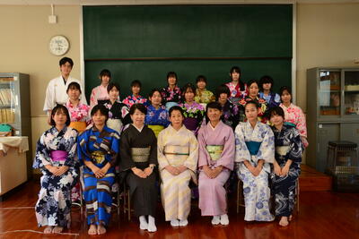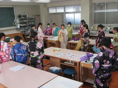 「ファッション造形」の授業の選択生は1学期に自分で製作した浴衣を、男子生徒は自分で製作した浴衣と袴を着装しました。