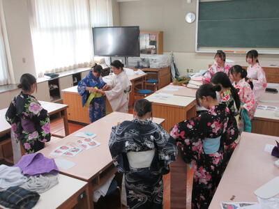 家政科学科3年生全員が、「浴衣・袴着付け講習会」に参加し、浴衣・袴の着装から帯結びまでを一人でできるよう学びました。