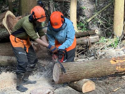 午後からは班に分かれて、機械操作体験、チェーンソーでの玉切り体験、ツリークライミングなどを体験しました。初めてのことばかりで、大変でしたが、とてもいい経験になりました。今回学んだことを今後の授業でも生かしていきたいです。